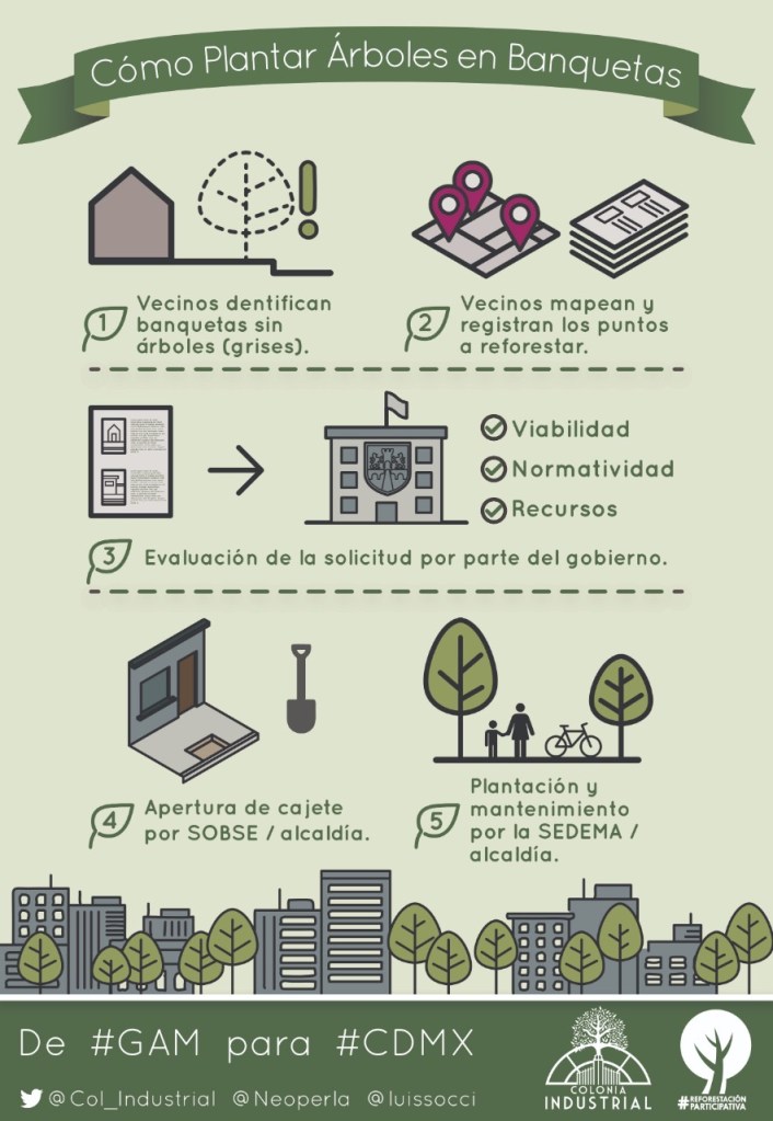 [1] La iniciativa ciudadana #ReforestacionParticipativa promueve la participación de los vecinos en identificar y solicitar sitios para arborizar banquetas o espacios ociosos; ésta nació en 2017 con el registro de banquetas grises (banquetas con poca o nula masa vegetal) en la Colonia Industrial, Alcaldía Gustavo A. Madero, CDMX. El registro fue presentado al la Secretaría de Gobierno y la Secretaría del Medio Ambiente ese mismo año, la solicitud fue atendida a través de una medida de compensación ambiental producto de la construcción de la Línea 7 del Metrobús. Este esfuerzo compartido entre ciudadanos y gobierno logró la plantación de 159 árboles.