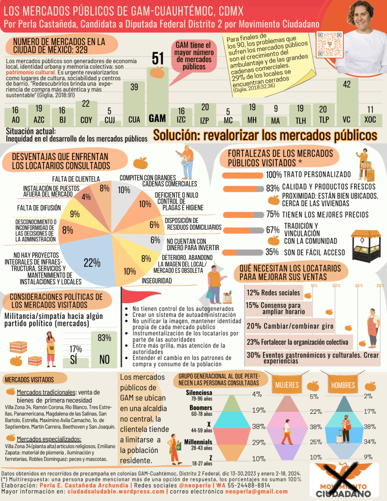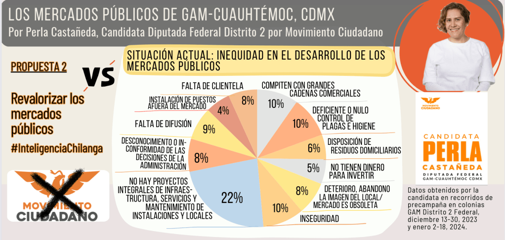 Frente a la inequidad en el desarrollo de los mercados públicos, propongo revalorizarlos mediante una inversión en proyectos integrales, promoción y respaldo constante reconociendo su patrimonio cultural.
