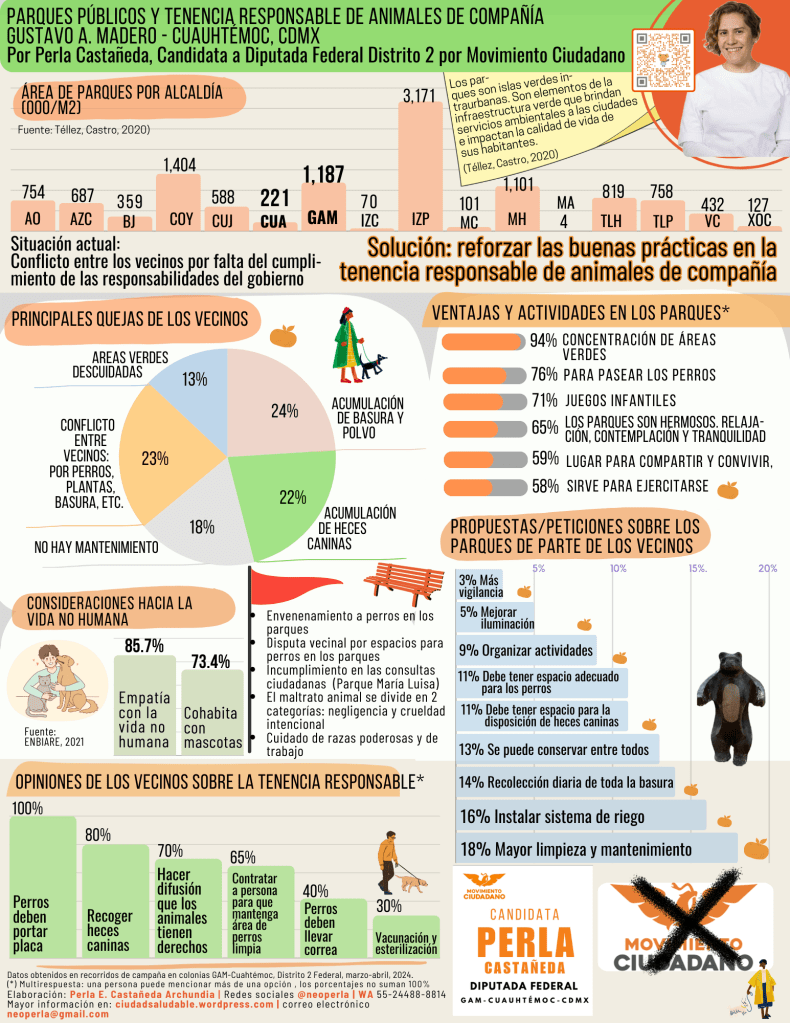 Reforzar las buenas prácticas en la tenencia responsable de animales de compañía. Desde el Congreso Federal exigiré el cumplimiento de las obligaciones de las autoridades en el mantenimiento y limpieza de los parques públicos.