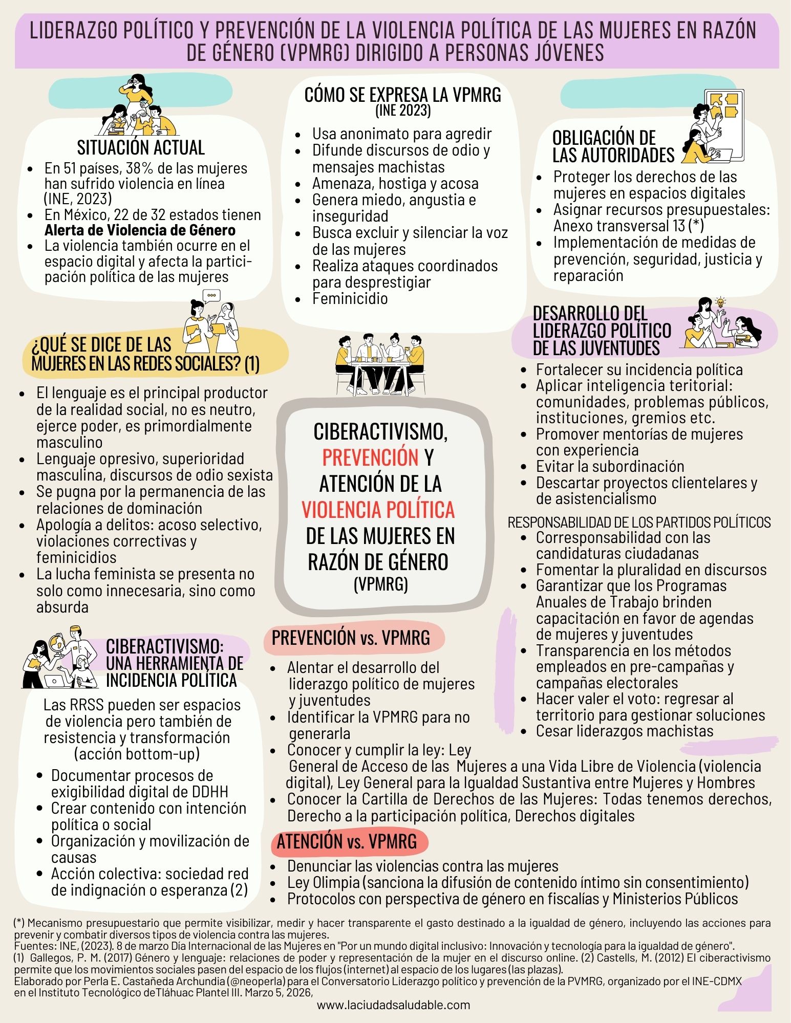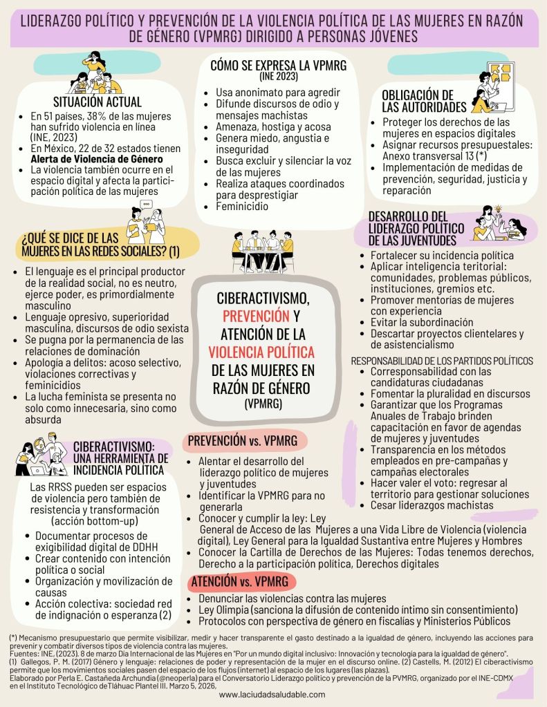 En el marco de la conmemoración del Día Internacional de la Mujer y en concordancia con las actividades que el Instituto Nacional Electoral (INE-CDMX) realiza en materia de fortalecimiento de la participación activa de las juventudes en la vida pública del país, fui convocada el pasado 6 de marzo 2026 para participar en una de las mesas temática en torno «Liderazgo político y prevención de la Violencia Política de las Mujeres en Razón de Género (VPMRG), dirigido a personas jóvenes con la ponencia Ciberactivismo, Prevención y Atención de la VPMRG